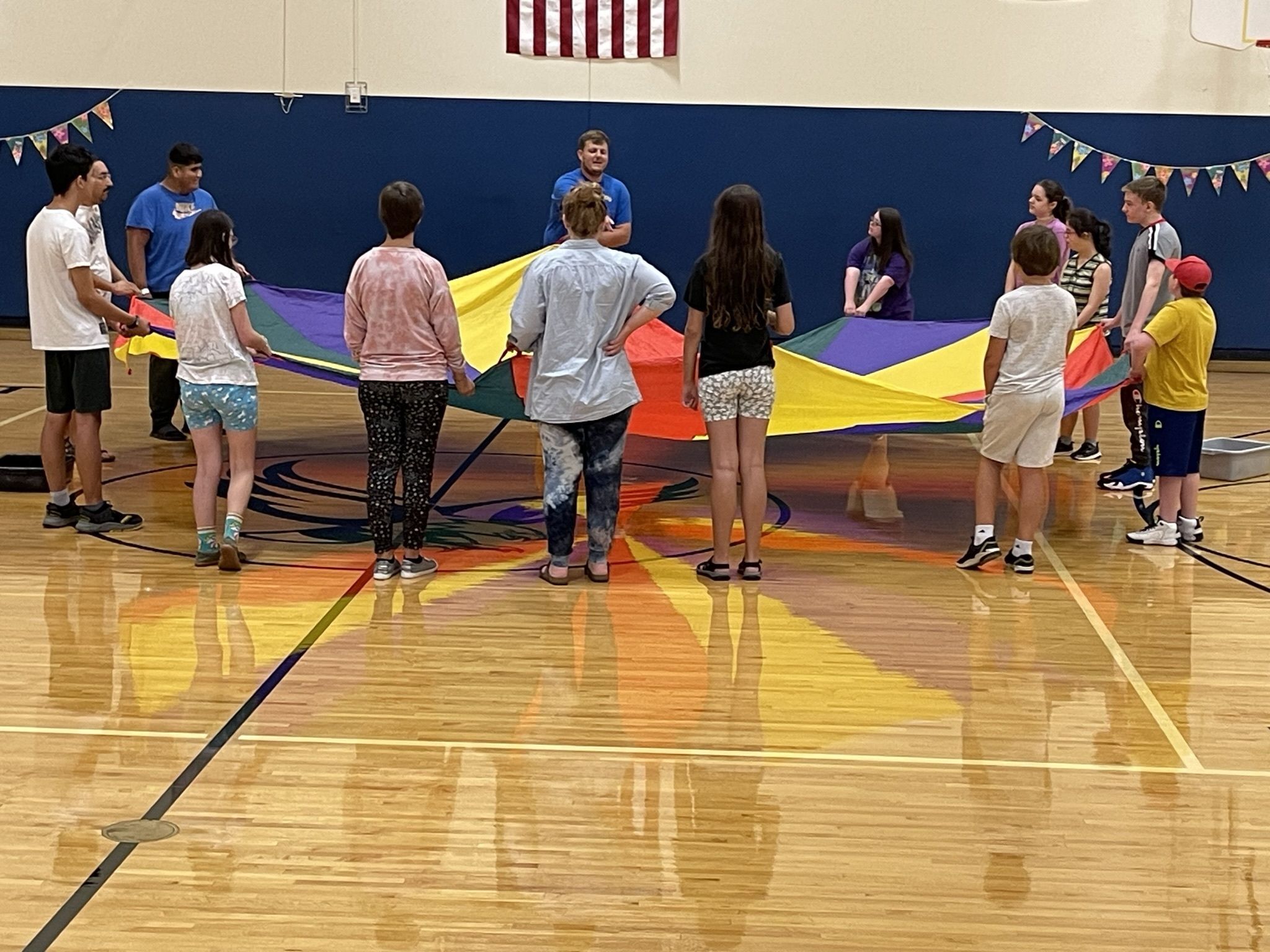 Camp mornings start off with a couple of group games. We did make it and take it basketball, balloon passes, but the group favorite was parachute games!