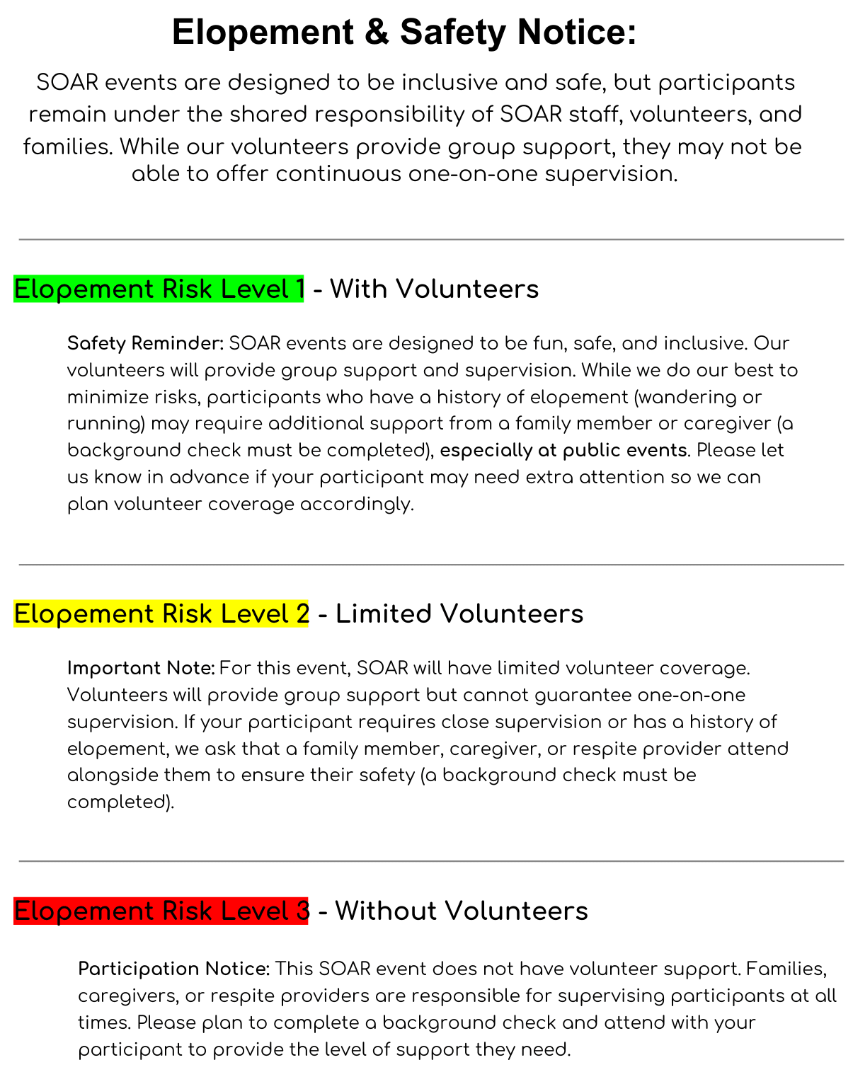 SOAR is for participants with disabilities age 13 and older. Caregivers are welcome if the participant needs more intensive support. If a parent or caregiver stays during a SOAR event, they are considered a SOAR helper and must complete a background check as required by our grant funder. Our hope is that these clubs would be for participants only, as SOAR is meant to further independence and provide opportunities to gain social skills with peers.